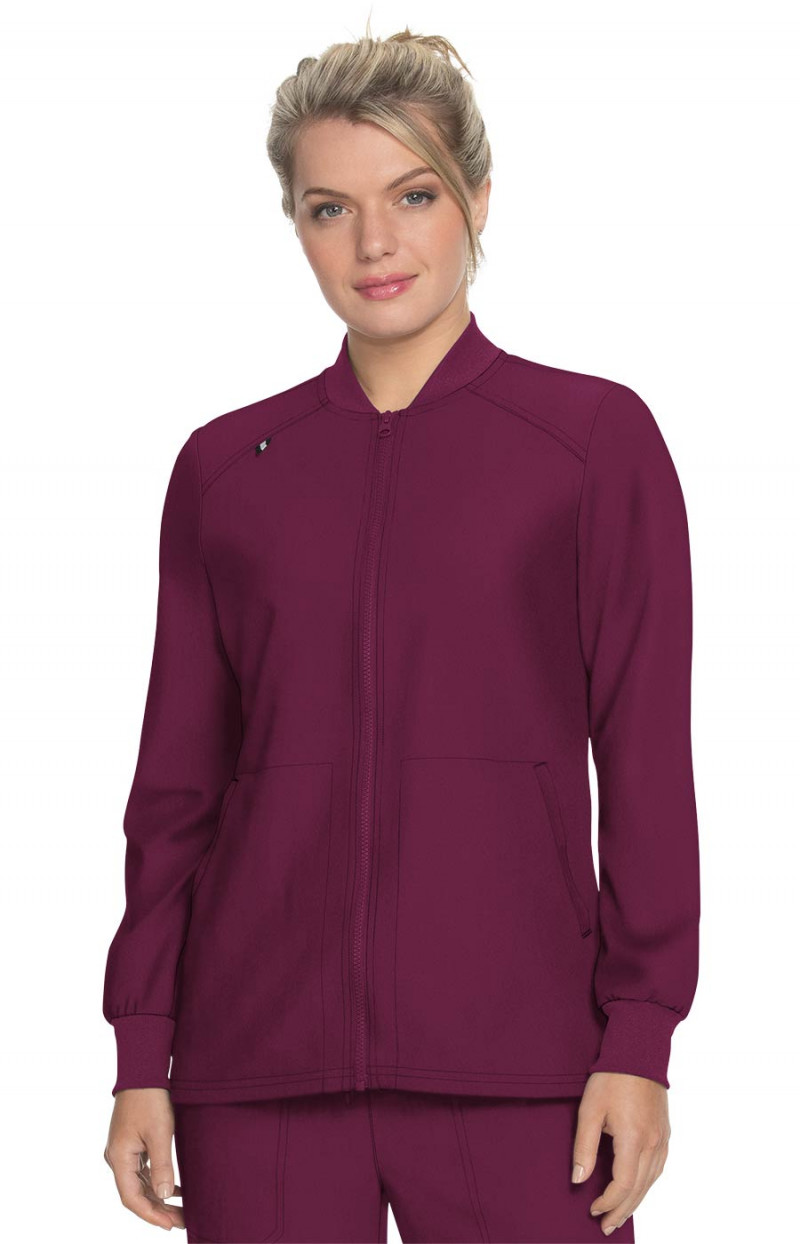 A great jacket to complement your outfit. Ultra soft to the touch. Contemporary fit. Zipper front, Ribbed neck and cuffs, 2 front pockets with print lining, 4-way stretch, 73% polyester, 22% rayon, 5 spandex stretch twill, koi Next Gen Always in Motion Women’s Stretch Jacket