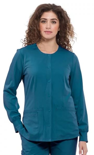 Healthcare professionals will appreciate the fit and feel of the HH Works Megan Scrub Jacket all shift long! Made with a high quality blend of stretch fabric, this snap front jacket offers a superior range of movement and comfort. Plenty of pockets give you lots of options to store essential instruments and accessories. HH Works Megan 4 Pocket Snap Front Scrub Jacket, Round neck, Snap front, Two front pockets, scissor pocket, mesh fabric media pocket, and two pen slots, Front princess seams, Back princess darts, Yoga knit cuffs, 91% polyester/9% spandex, Medium center back length: 25 1/2″