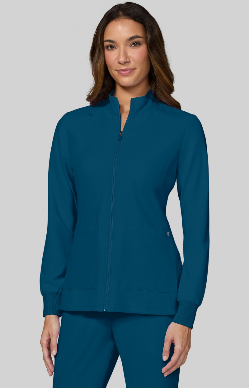 Warm up in this stylish, modern, super comfy women’s jacket. Contemporary fit. Zipper front, 2 front pockets, 3 pen slots, Ribbed cuffs at sleeves, Length Size Small: 30 1/4″, 100% polyester stretch twill, Cureology Geneses Women’s 2-Pocket Jacket