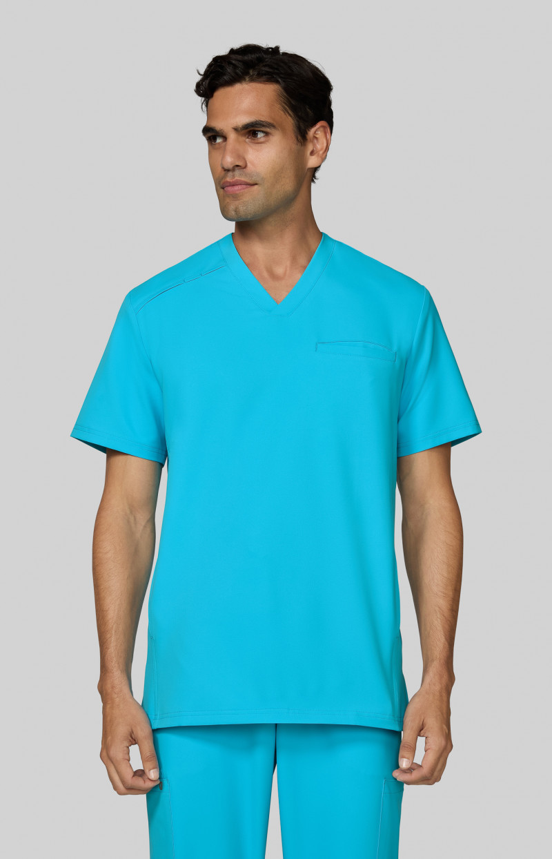 This everyday men’s top is the cure for the common scrub! Looks and feels amazing. Modern classic fit. Classic v-neck, Chest pocket, 2 side entry pockets, ID badge loop, Side slits, Looks great tucked in or out, Length Size M: 29 5/8″, 100% polyester stretch twill, Cureology Stasis Men’s 3-Pocket V-Neck Scrub Top