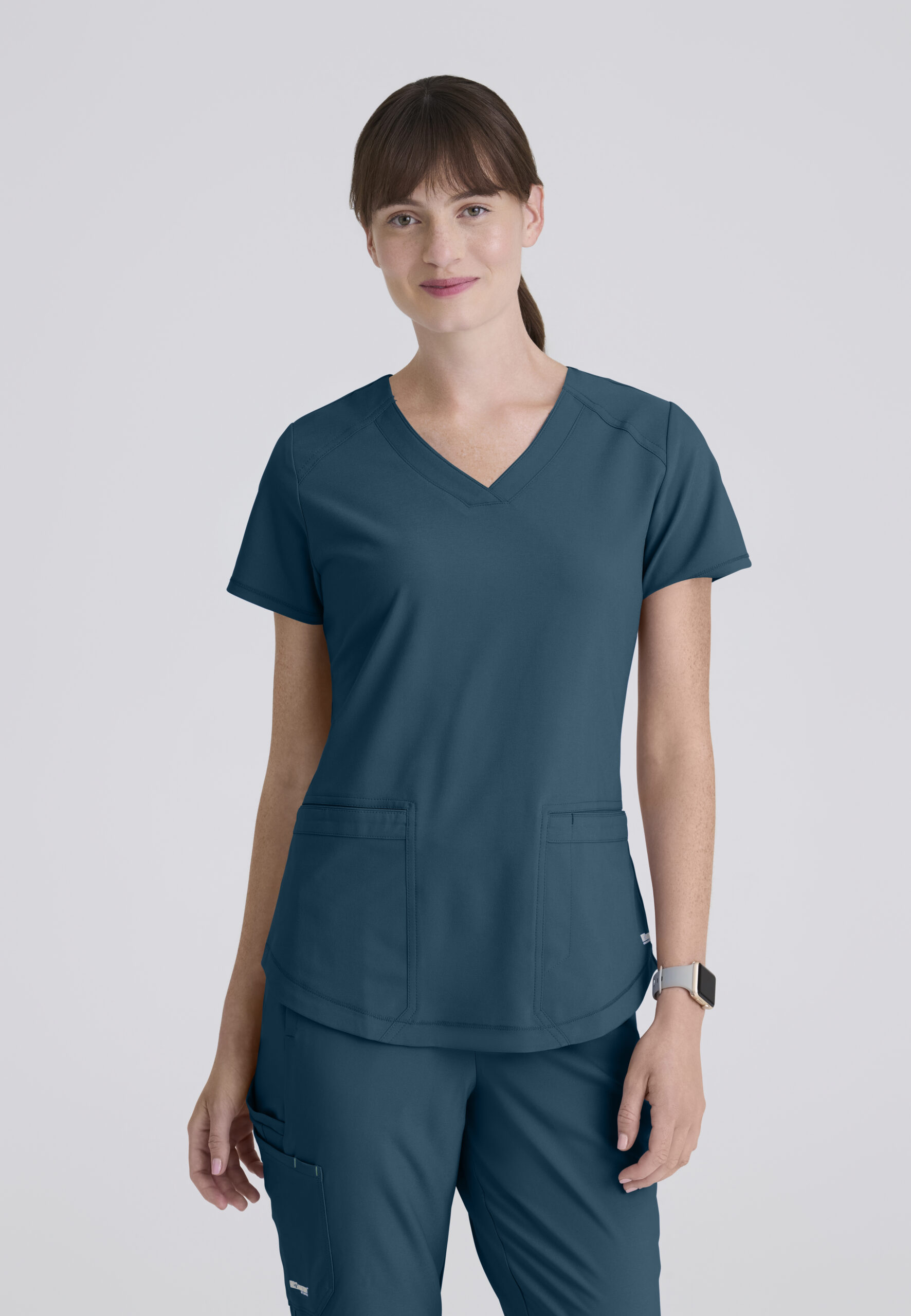 The Rhythm Scrub Top from the Grey’s Anatomy by Barco Evolve collection is your classic V-neck top with a new sleek look and flattering princess seams. Featuring two inset waist pockets and a pen pocket offering a clean and modern look. Made with recycled polyester and CiCLO® technology, the fabric is soft, stretchy, and breathable for all-day comfort. 2 pockets total, 2 front welt pockets, Pen slot on left pocket, Fit: Classic, Crossover V-neck, Front shoulder yoke, Double needle and cover stitch detail throughout, Back princess seams, Shirttail hem, Center back length: 25.5″ (small), 48% CiCLO® Polyester Material: 44% Recycled Polyester 8% Spandex, 360 stretch, Moisture wicking, Wrinkle release