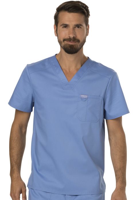 A Men’s V-neck top features a chest pocket with extra pen pocket and I.D. loop, back yoke and side vents. Center back length: 29”