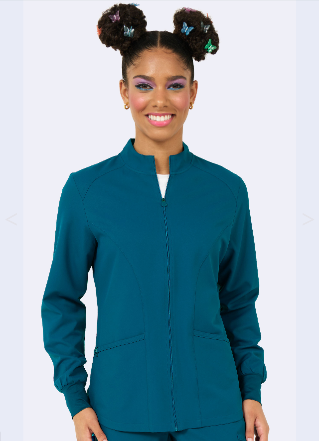 100% Polyester, Stand Collar, Zipper Front, 2 Front Pockets, elastic bungee on right pocket, front and back shoulder yokes, long eleeve with knit cuffs