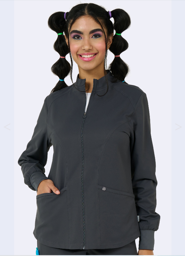 100% Polyester, Stand Collar, Zipper Front, 2 Front Pockets, elastic bungee on right pocket, front and back shoulder yokes, long eleeve with knit cuffs