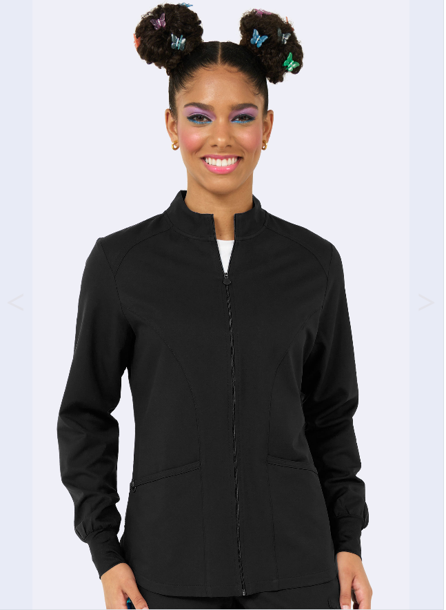 100% Polyester, Stand Collar, Zipper Front, 2 Front Pockets, elastic bungee on right pocket, front and back shoulder yokes, long eleeve with knit cuffs