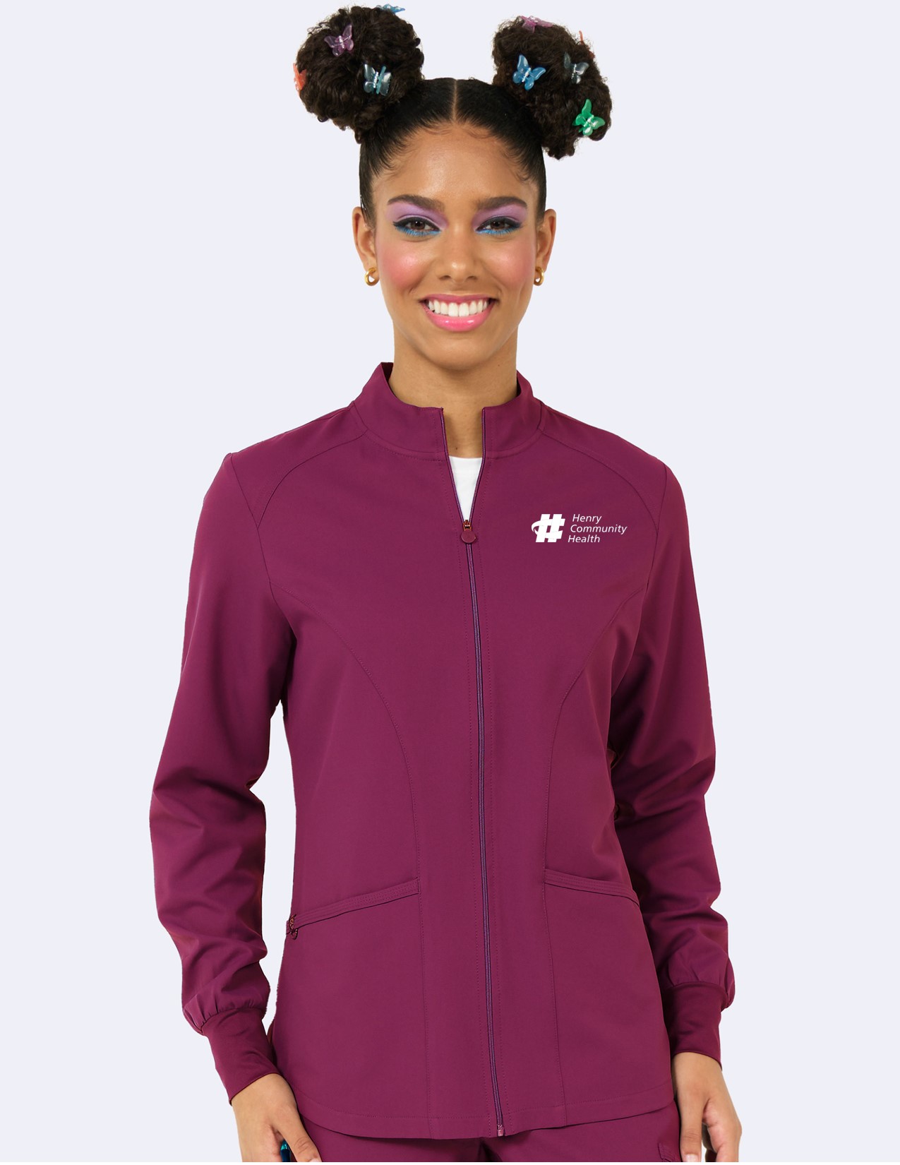 100% Polyester, Stand Collar, Zipper Front, 2 Front Pockets, elastic bungee on right pocket, front and back shoulder yokes, long eleeve with knit cuffs
