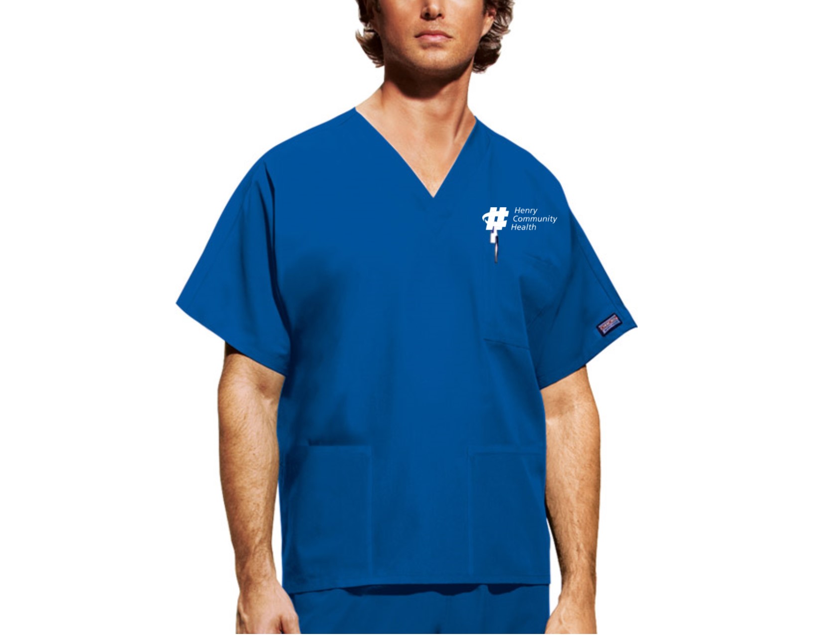 This Unisex V-neck top has one chest pocket and two patch pockets. Side vents. Center back length 29″