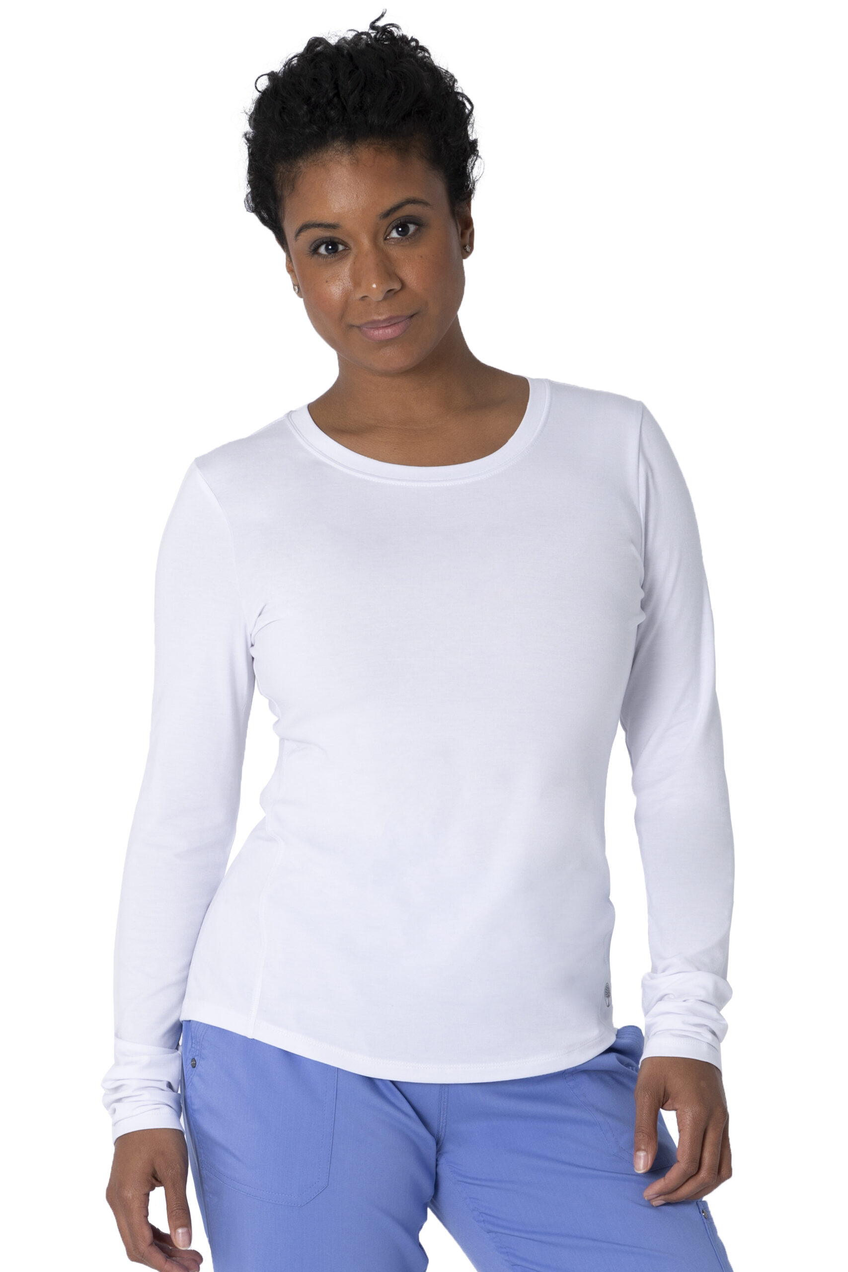 The Healing Hands 5051 Mackenzie Long Sleeve Tee features long sleeves and a crew neck with shaped body. Fabric content is 48/48/4 poly/rayon/spandex. The approximate length for size M is 27″