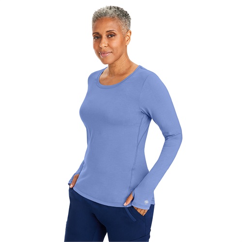 The Healing Hands 5051 Mackenzie Long Sleeve Tee features long sleeves and a crew neck with shaped body. Fabric content is 48/48/4 poly/rayon/spandex. The approximate length for size M is 27″