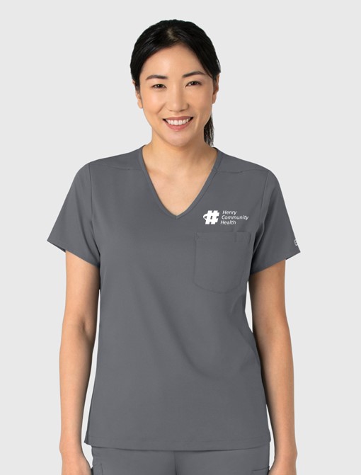 A softly curved V-neck and a high-to-low hem give this women’s tuck-in scrub top a flattering fit that’s modern and fresh. Pockets make sure practicality stays a priority, including a chest pocket that has a bartack stitch for your pen, plus a back card pocket that zips shut to keep small items close and secure. A loop on both shoulders provides a place for your badge on whichever side you find more convenient. The modern fit strikes the perfect balance of letting you move freely without feeling like it’s baggy or loose. Side hem vents open up the profile so you get full range of motion as you make your way through a shift. Tuck this scrub top into your favorite scrub pants or let it hang loose with its tailored drape.