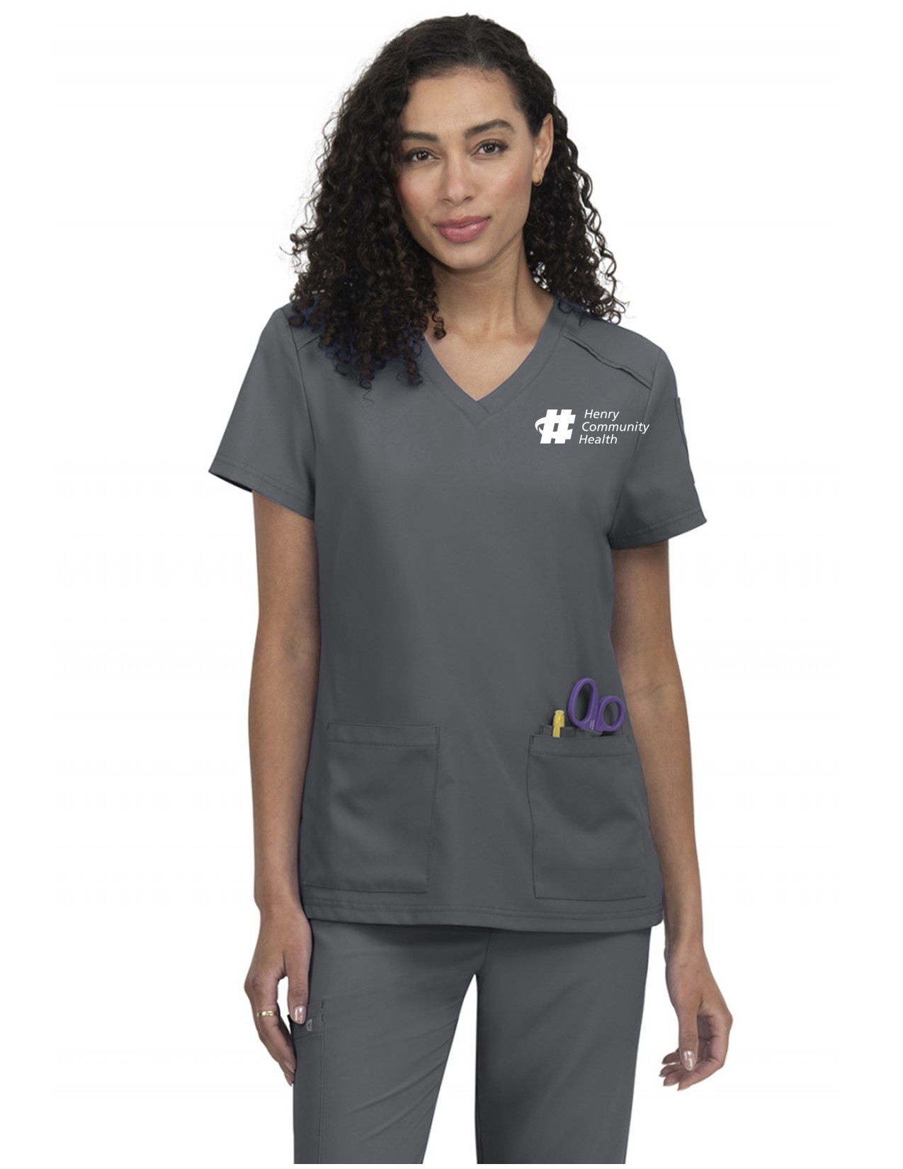 Introducing the cure for the common scrub, Cureology! The Cardi scrub top combines fashion with functionality at a great price. Modern Classic fit. Classic v-neck, 2 front pockets, 3 pen slots, Sleeve pocket, Loop for ID badge, Side slits, Length, size Small: 27″, 100% polyester stretch twill