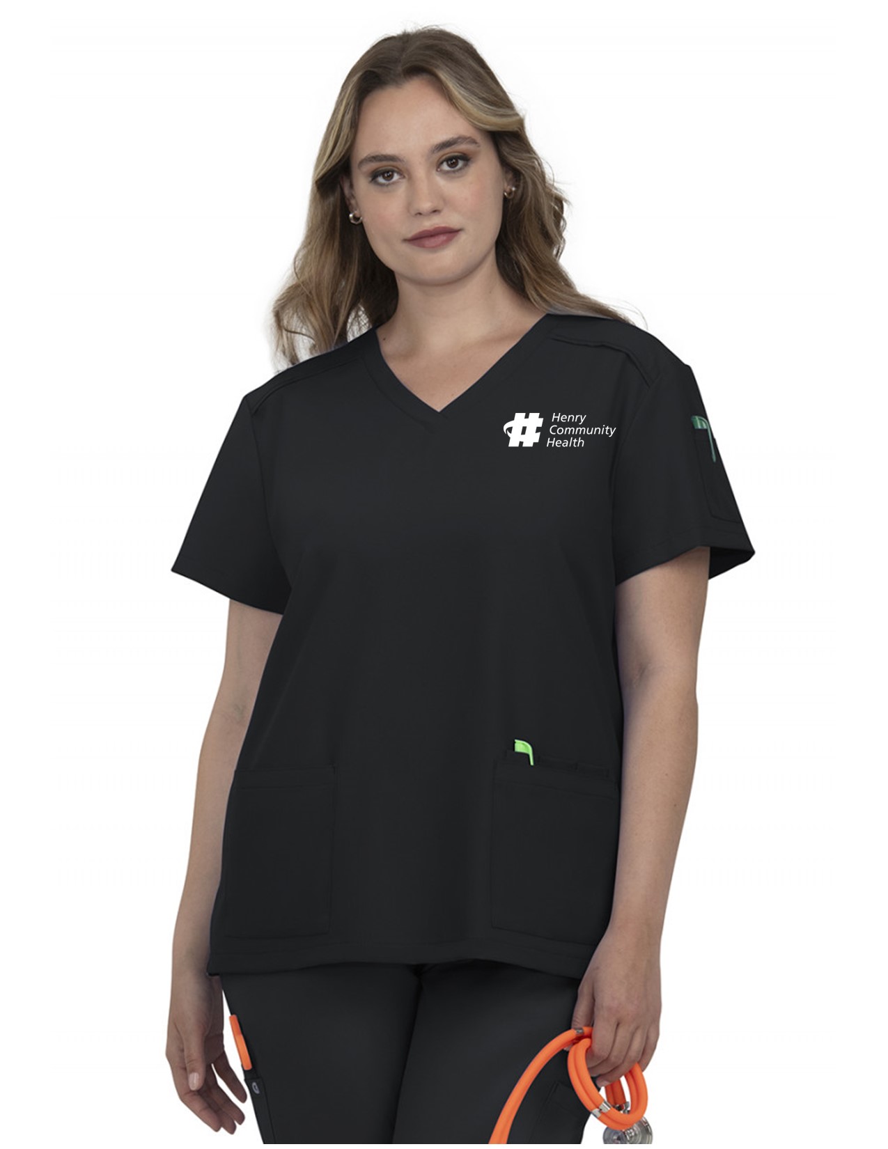 Introducing the cure for the common scrub, Cureology! The Cardi scrub top combines fashion with functionality at a great price. Modern Classic fit. Classic v-neck, 2 front pockets, 3 pen slots, Sleeve pocket, Loop for ID badge, Side slits, Length, size Small: 27″, 100% polyester stretch twill