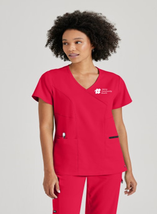 3 Pocket, V-Neck Surplice with front and back princess seams, zip front pocket 74% Polyester/23% Rayon/3% Spandex Twill
