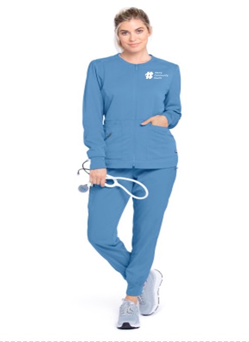 3 Pocket, Rib Neck, Zip Front Jacket. PDA and Zip Pocket, Princess Seamed Front, Back seams and Ribbed Cuffs