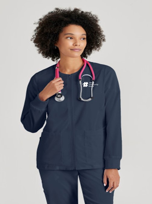 5 Pocket, Round Neck, zip Front, PDA and Zipper Pocket, Ribbed Back Panel Rib Cuff Jacket, Antimicrobial Finish 74% Polyester/23% Rayon/3% Spandex Twill