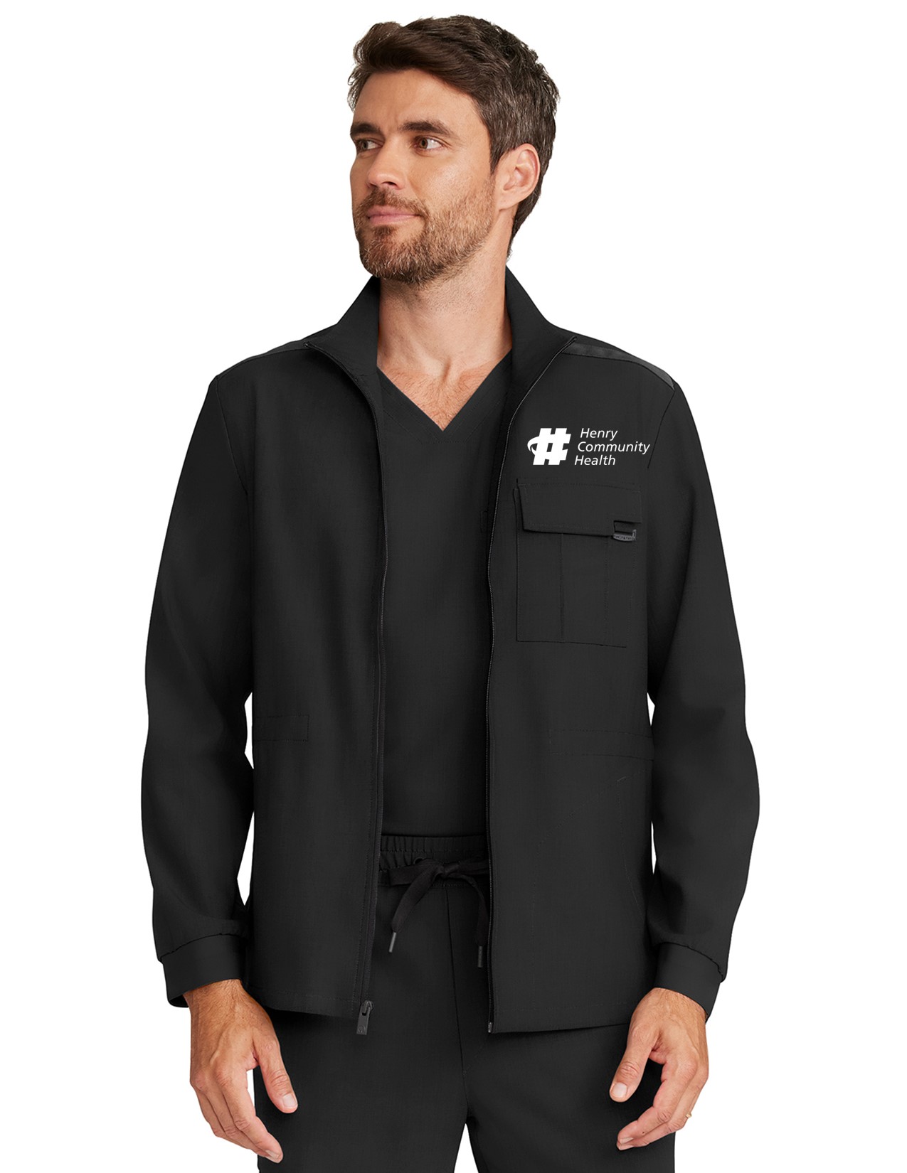Perfect for work-to-weekend wear, the Austin zip front jacket boasts exceptional design details. There is a logo zipper pull, stand-up collar, grosgrain ribbon trim on the shoulder seams, and patterned elastic sleeve cuffs. This utility jacket is partially lined with knit on the inside front and back yoke to guard against cool days and cold hospitals. There are four pockets for stylish storage: one pintucked chest pocket with flap and logo D-ring, two front welt pockets, and one cell pocket on the inside left. Exterior pockets have printed pocket bags. Adjust the waist using the bungee cord and toggles for a customizable fit. The curved back yoke provides a better fit across the shoulders. Side vents at hem for ease of movement. The soft four-way stretch fabric includes moisture wicking for added comfort. Modern fit. Center back length (size Medium): 281/2″