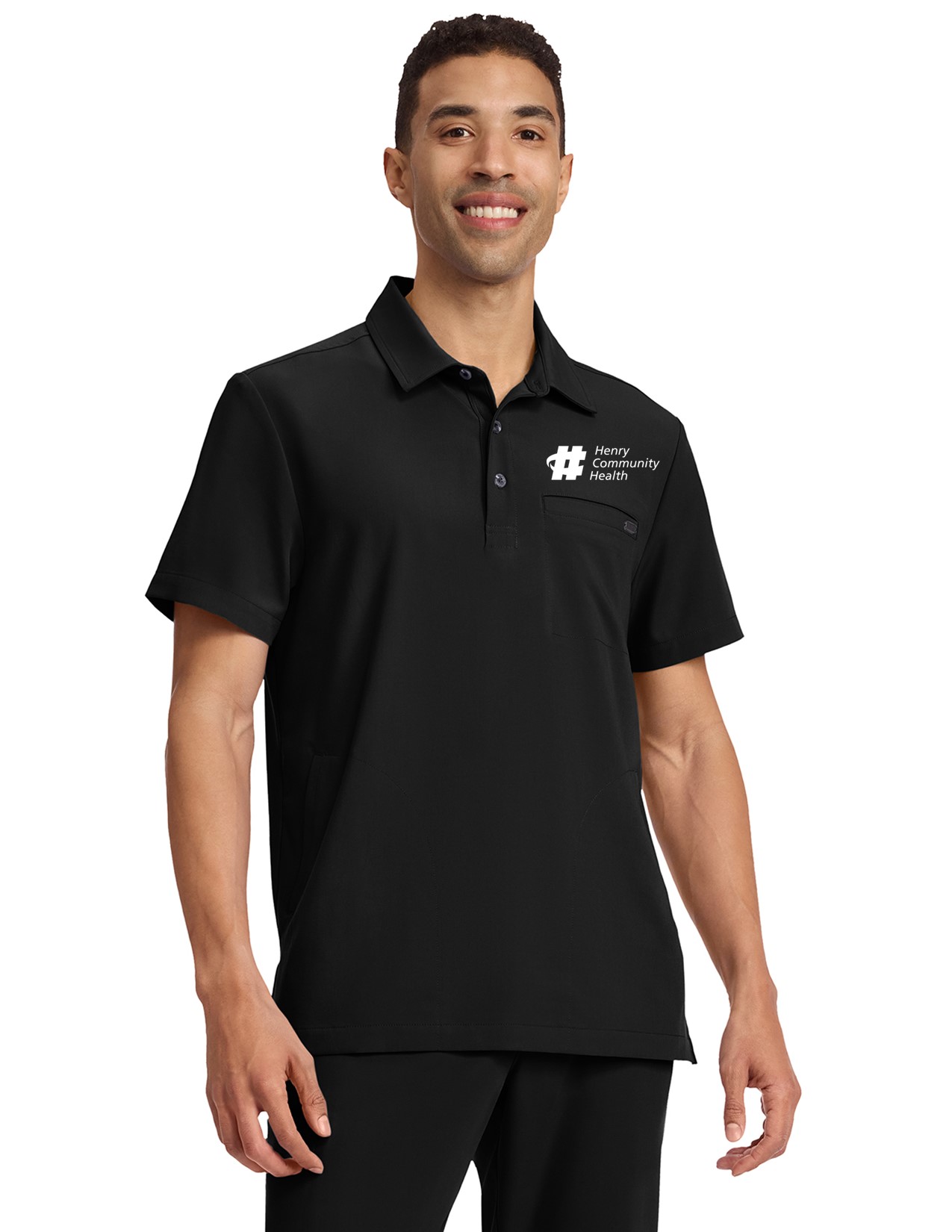 This modern-fit polo collar top combines style and practicality. It features a shirt collar with a 1/2 placket and button closure, plus a signature D-ring detail on the back yoke. With three pockets – one chest welt and two side-entry – this top offers convenient storage. Side slits enhance comfort, while a center back length of 29 1/2″ provides a flattering fit. Ideal for both work and casual wear.