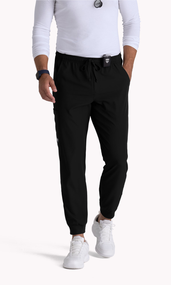 3 Pocket, self full encased elastic wasitband with drawsting, zip-fly, velcro closure single patch cargo pocket, rib cuff jogger
