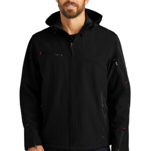 Our hooded soft shell stands up to the elementsand stands out with texture and bar tack details. Highly breathable with stretch this wind-resistant water-repellent jacket is just right for the workday or the weekend. A hood and zippered sleeve vents add function and up-to-the-minute appeal. 96/4 poly/spandex woven shell bonded to a water-resistant film insert and a 100% polyester microfleece 1000MM fabric waterproof rating 1000G/M2 fabric breathability rating Hood with locking drawcord for adjustability Storm flap with chin guard Ergonomic zipper pulls Zippered chest and sleeve pockets with contrast bar tack Front zippered pockets with contrast bar tack Open hem with drawcord and toggles for adjustability
