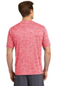 Our color-locking tee has a soft hand wicks moisture resists snags and is energized with an allover heather pattern. 4.1-ounce 100% polyester jersey with PosiCharge technology Removable tag for comfort and relabeling Set-in sleevesIf applying sublimation special care must be taken throughout the process. Contact your decorator for more details.
