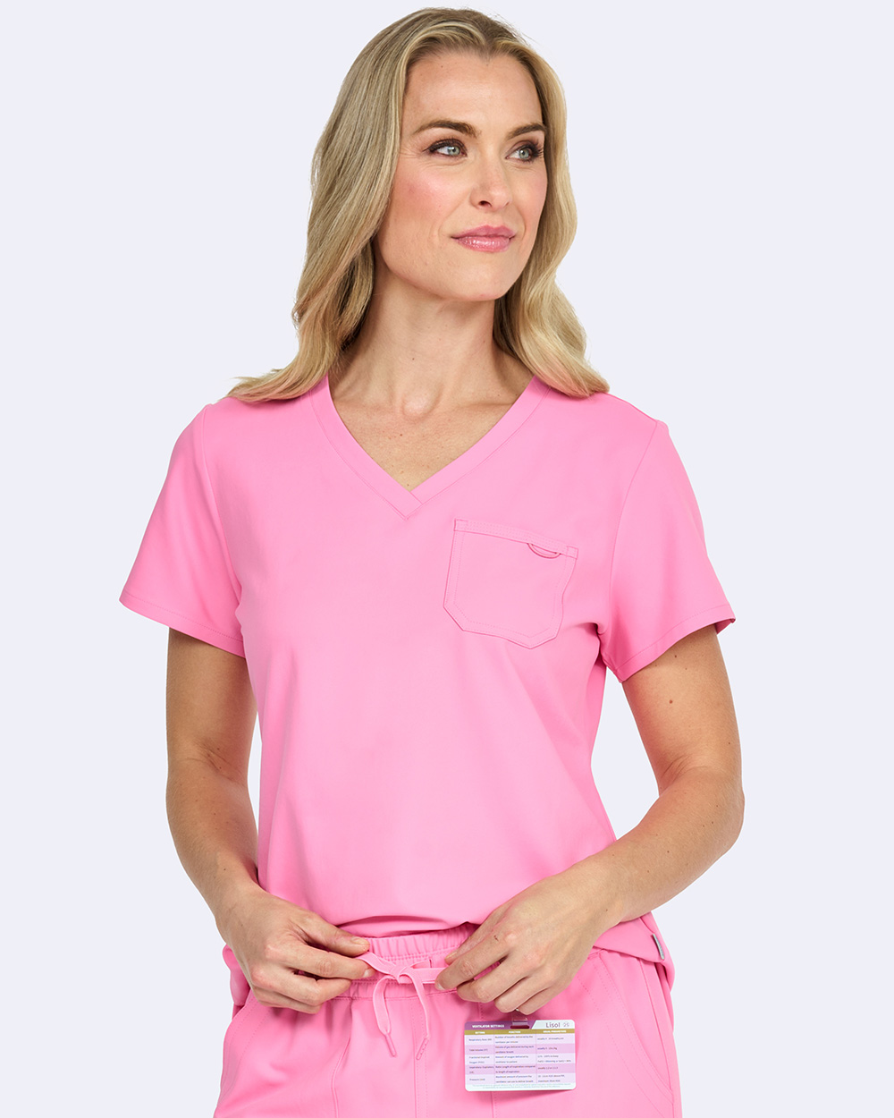 100% Polyester, V-Neck, Tuck in or wear it out , elastic bungee loop on chest pocket