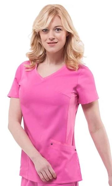 77% Polyester / 20 % Rayon / 3% Spandex Stylish V- neck, stretch side panels, 2 patch pockets, Ribbon details for style, Center Back Length: 25”
