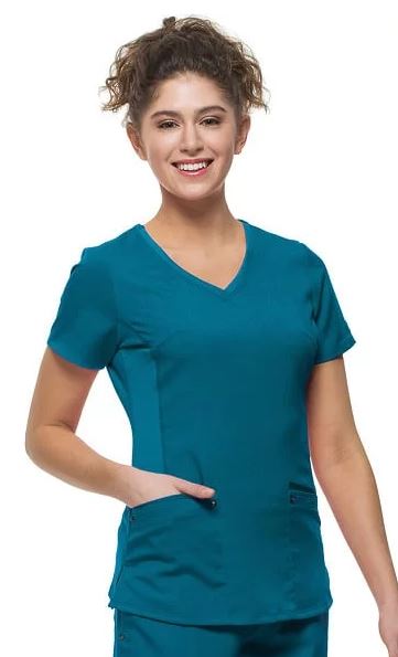 77% Polyester / 20 % Rayon / 3% Spandex Stylish V- neck, stretch side panels, 2 patch pockets, Ribbon details for style, Center Back Length: 25”