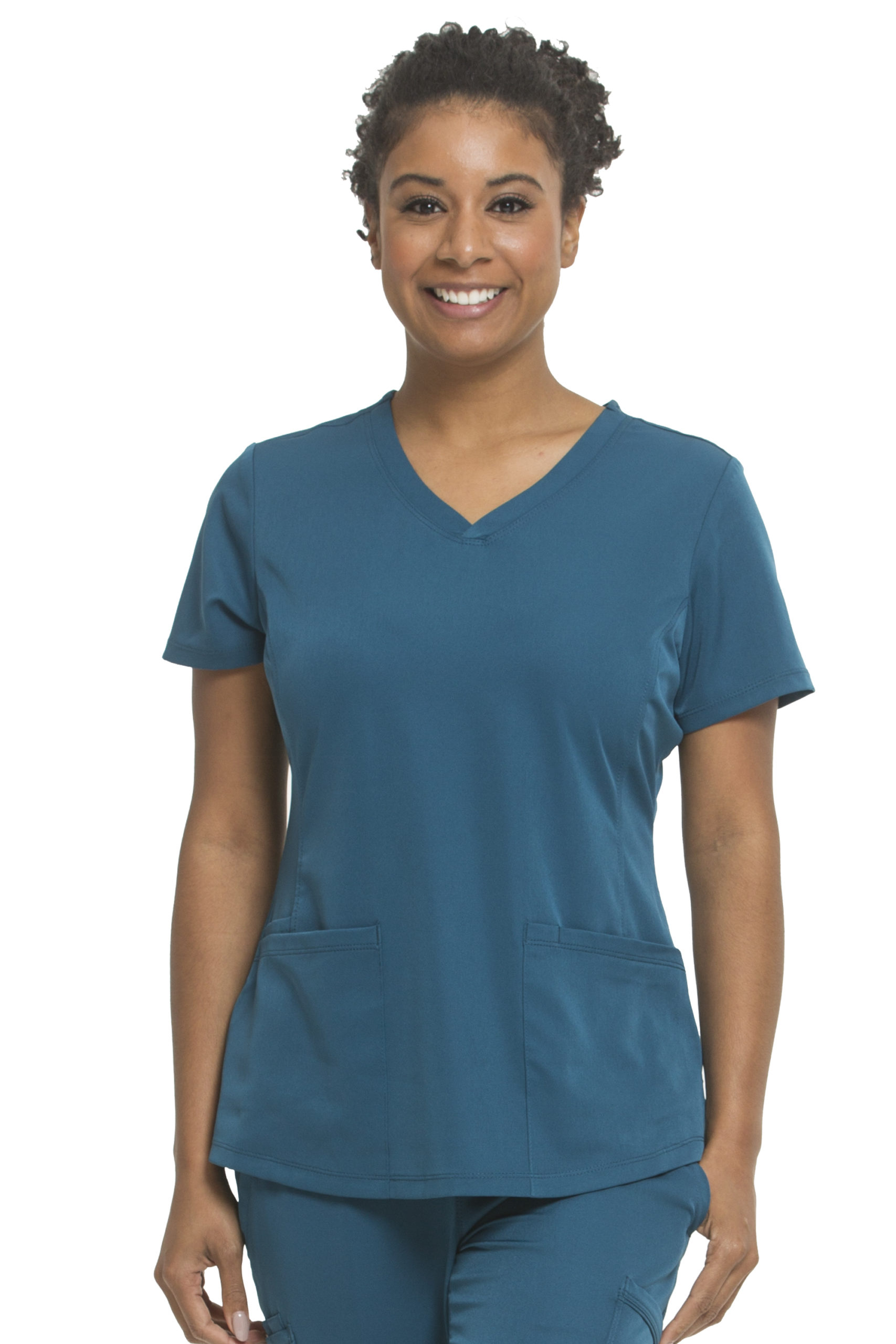 91% Polyester/9% Spandex HH Works provides the comfort and style that you deserve in work attire! The Monica V-neck Scrub Top is made with soft stretch fabric that is a favorite of healthcare professionals. This great looking top includes princess seams for shaping and spacious pockets to hold your go-to accessories. V-neck, Two patch pockets, scissor pocket, mesh fabric media pocket, and pen slot, Front princess seams, Back princess darts, Side slits, 91% polyester/9% spandex, Medium center back length: 24″