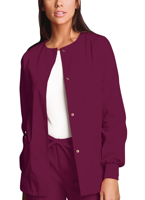 65% Polyester / 35% Cotton Poplin With Soil Release A Traditional Classic fit, round neck snap front warm-up with two patch pockets, knit cuffs, and a cell phone pocket. Center back length: 27 1/2″.