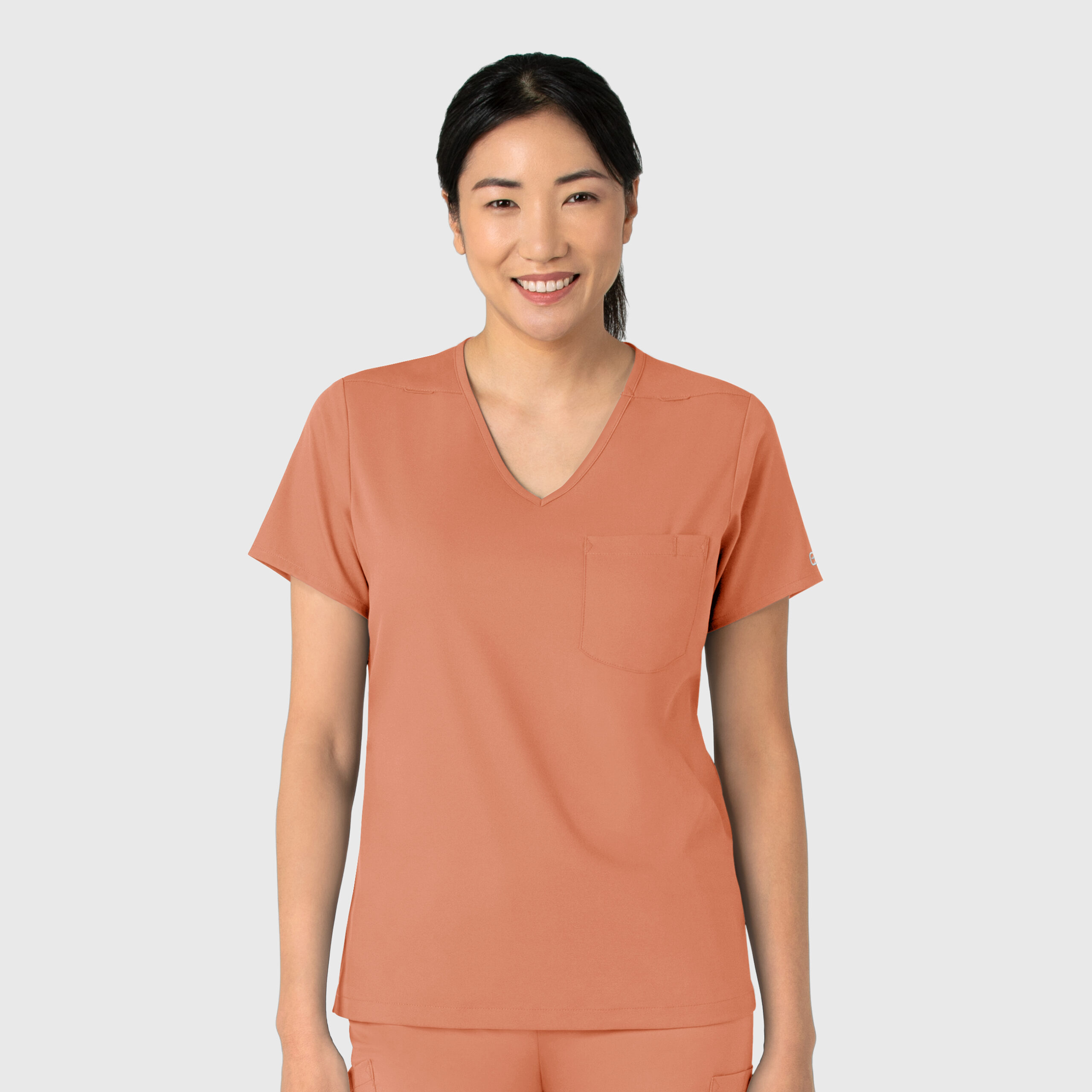 50% Polyester/43% Recycled Polyester/7% Spandex A softly curved V-neck and a high-to-low hem give this women’s tuck-in scrub top a flattering fit that’s modern and fresh. Pockets make sure practicality stays a priority, including a chest pocket that has a bartack stitch for your pen, plus a back card pocket that zips shut to keep small items close and secure. A loop on both shoulders provides a place for your badge on whichever side you find more convenient. The modern fit strikes the perfect balance of letting you move freely without feeling like it’s baggy or loose. Side hem vents open up the profile so you get full range of motion as you make your way through a shift. Tuck this scrub top into your favorite scrub pants or let it hang loose with its tailored drape.