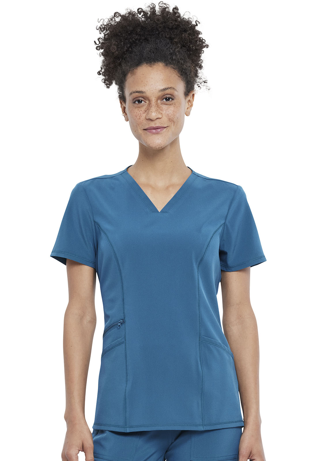 This Contemporary fit v-neck top features front and back princess seams plus back yoke seams. There are three pockets: two front patch pockets and a zip cell phone pocket above the right patch pocket. Side vents for ease of movement. Center back length: 26″