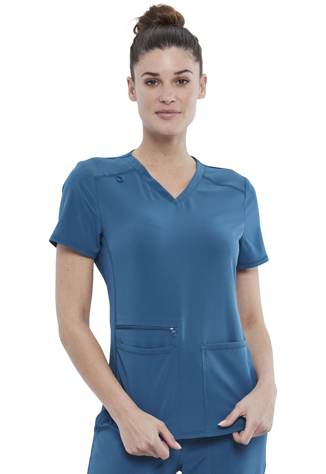 This Contemporary fit v-neck top has front and back yoke seams and a bungee ID badge loop at the right front yoke. Other features include front and back princess seams, front side panels, side vents and a shirttail hem. There are three pockets: two front patch pockets and one zip cell phone pocket. Center back length: 26″