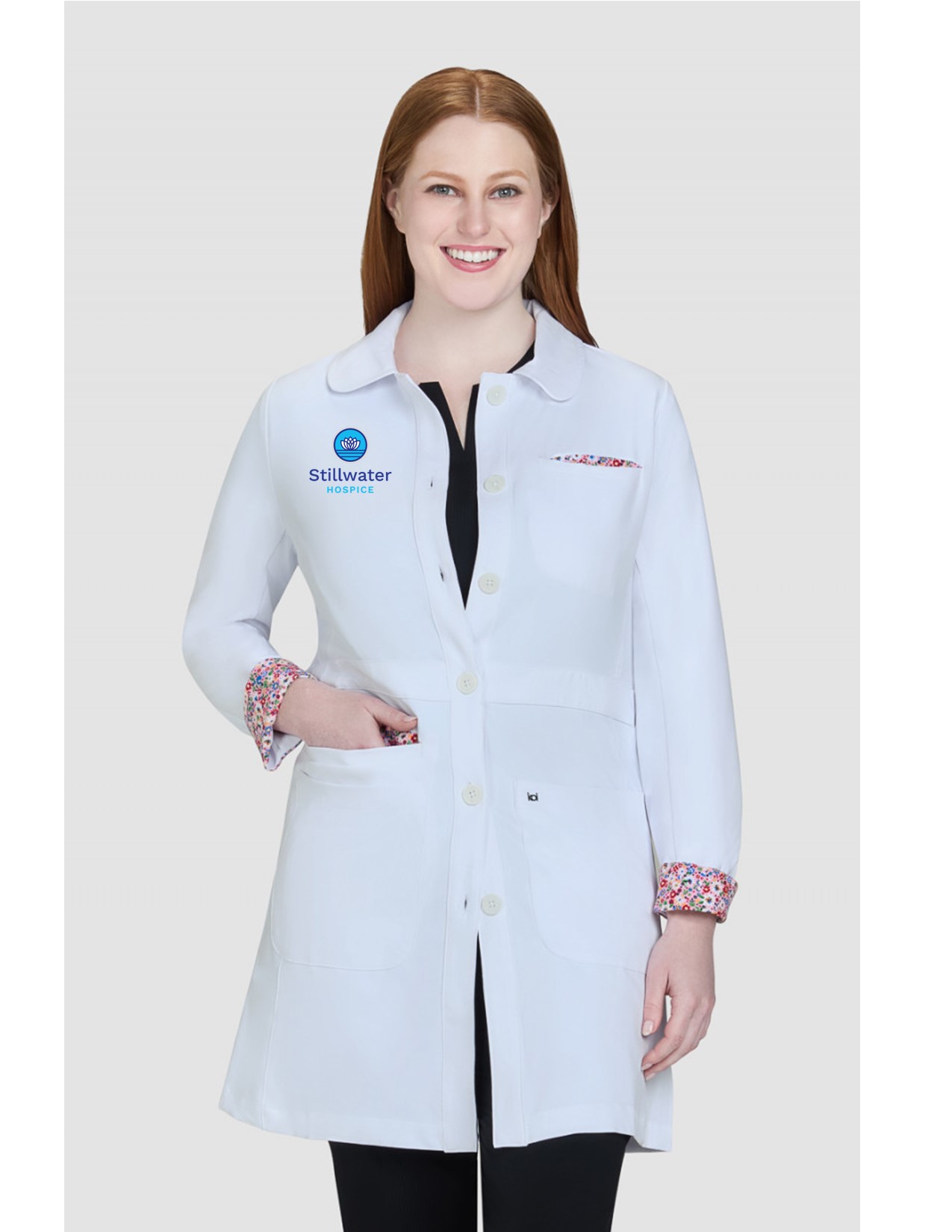 The perfect lab coat that beautiful, stylish, and professional. Modern classic fit. Button-front with pearlescent buttons, 4 front pockets, including a welt pocket that fits an iPad or tablet, Beautiful print lining at back of neck and sleeve, Back vent, Length Size Small: 34 1/2″, 100% polyester, koi Scrubs Essentials Fusion Women’s 4-Pocket Lab Coat