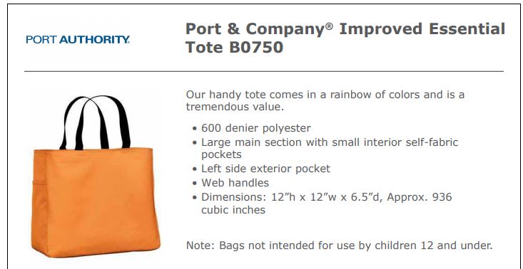 This strong durable tote comes in a rainbow of colors and is a tremendous value.600 denier polyester canvas Large main section with small interior self-fabric pockets Exterior side pocket Web handles Dimensions: 12 h x 12 w x 6.5 d Approx. 936 cubic inchesNote: Bags not intended for use by children 12 and under. Includes a California Prop 65 and social responsibility hangtag.