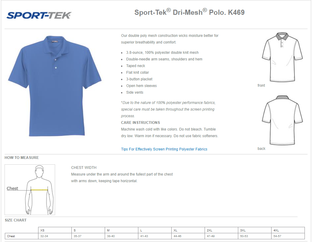 Our double poly mesh construction wicks moisture better for superior breathability and comfort.3.8-ounce 100% polyester double knit mesh Double-needle arm seams shoulders and hem Taped neck Flat knit collar 3-button placket Open hem sleeves Side vents*Due to the nature of 100% polyester performance fabrics special care must be taken throughout the screen printing process.