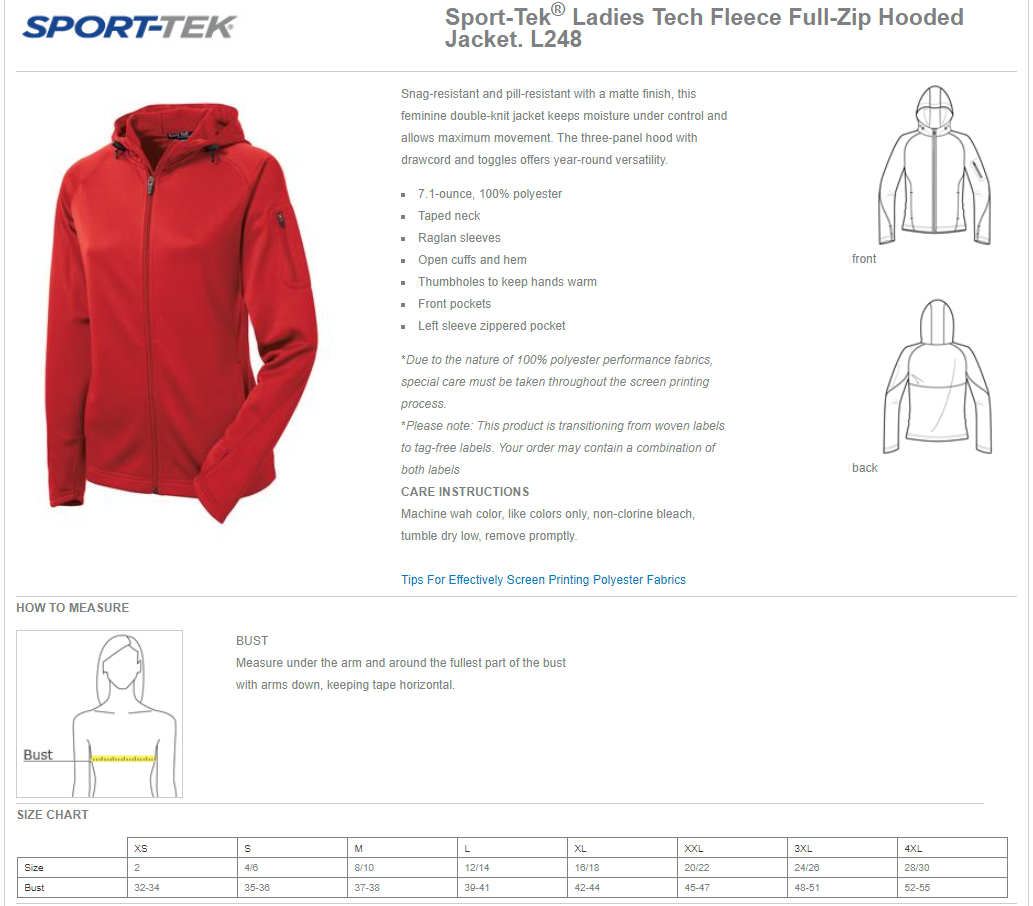 Snag-resistant and pill-resistant with a matte finish this feminine double-knit jacket keeps moisture under control and allows maximum movement. The three-panel hood with drawcord and toggles offers year-round versatility. 100% polyester Gently contoured silhouette Taped neck Raglan sleeves Open cuffs and hem Thumbholes to keep hands warm Front pockets Left sleeve zippered pocket *Due to the nature of 100% polyester performance fabrics special care must be taken throughout the screen printing process.*Please note: This product is transitioning from woven labels to tag-free labels. Your order may contain a combination of both labels