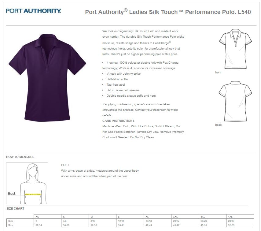 We took our legendary Silk Touch Polo and made it work even harder. The durable Silk Touch Performance Polo wicks moisture resists snags and thanks to PosiCharge technology holds onto its color for a professional look that lasts. There’s just no higher performing polo at this price. 4-ounce 100% polyester double knit with PosiCharge technology; White is 4.3-ounce for increased coverage V-neck with Johnny collar Self-fabric collar Tag-free label Set in open cuff sleeves Double-needle sleeve cuffs and hemIf applying sublimation special care must be taken throughout the process. Contact your decorator for more details.