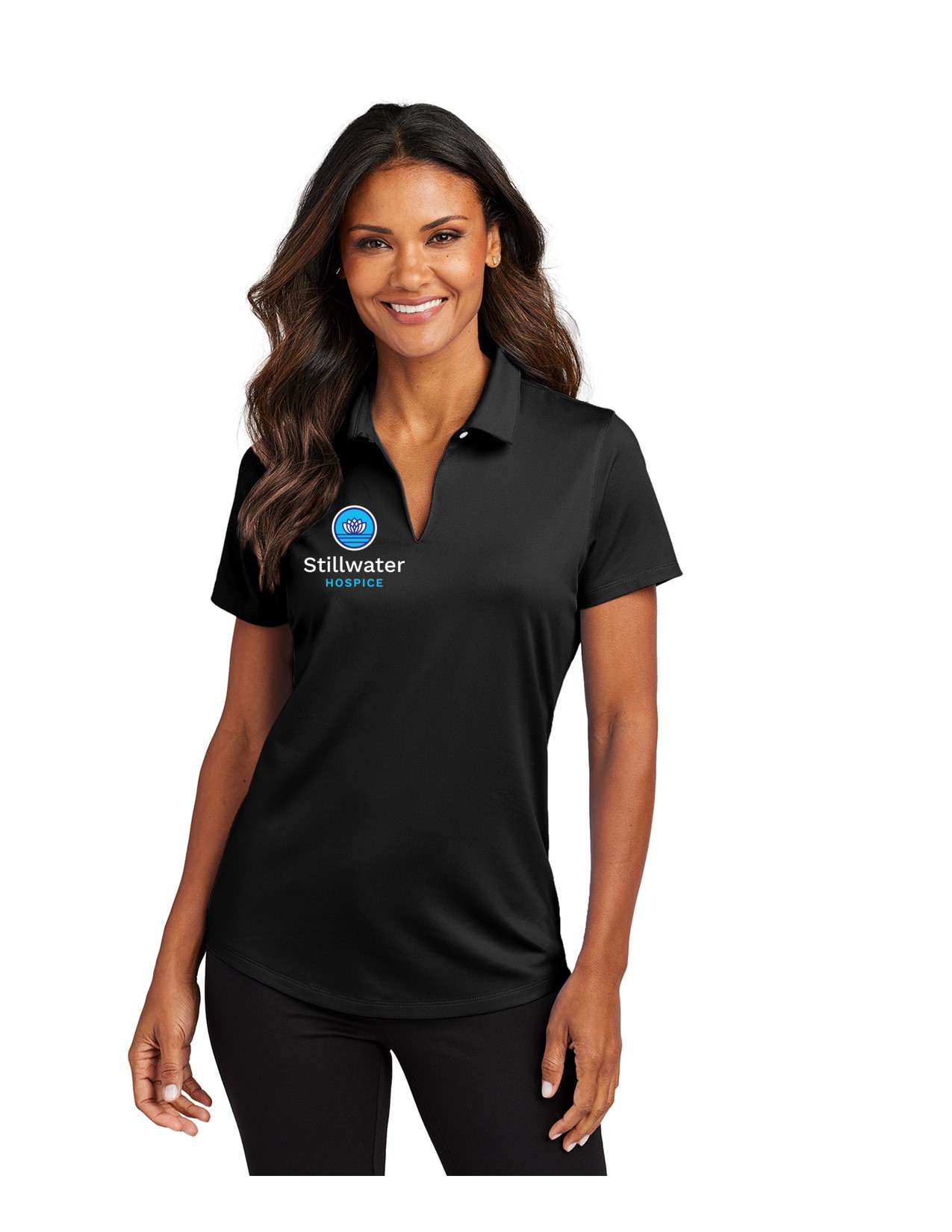 A polished look is easily achieved in this elevated style that combines professionalism with snag- and odor-resistance, plus moisture wicking performance. 5.6-ounce, 94/6 poly/spandex jersey, Snag-resistant, Stretch, Moisture-wicking, Odor-resistant, Easy Care, Self-fabric collar with collar stand, Single-button keyhole neck, Curved drop tail hem, Tag-free label