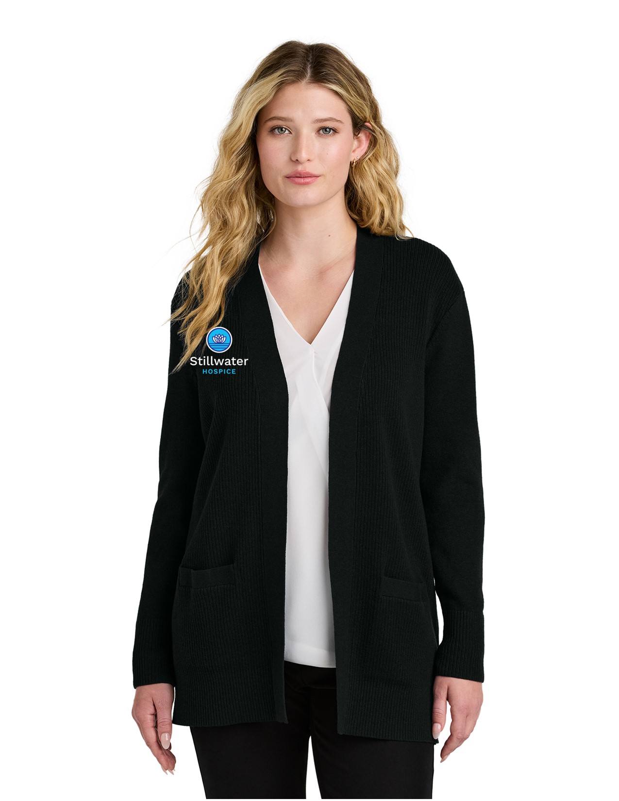 Blending professionalism with supreme comfort, this beautiful tri-blend sweater is an exceptional addition to any work wardrobe. 56/29/15 cotton/nylon/acrylic, Fully-fashioned seams, Machine washable, 2×1 rib knit front body, cuffs and back hem, Jersey sleeves and back body, Rib knit front lapel, Front pockets, Longer length