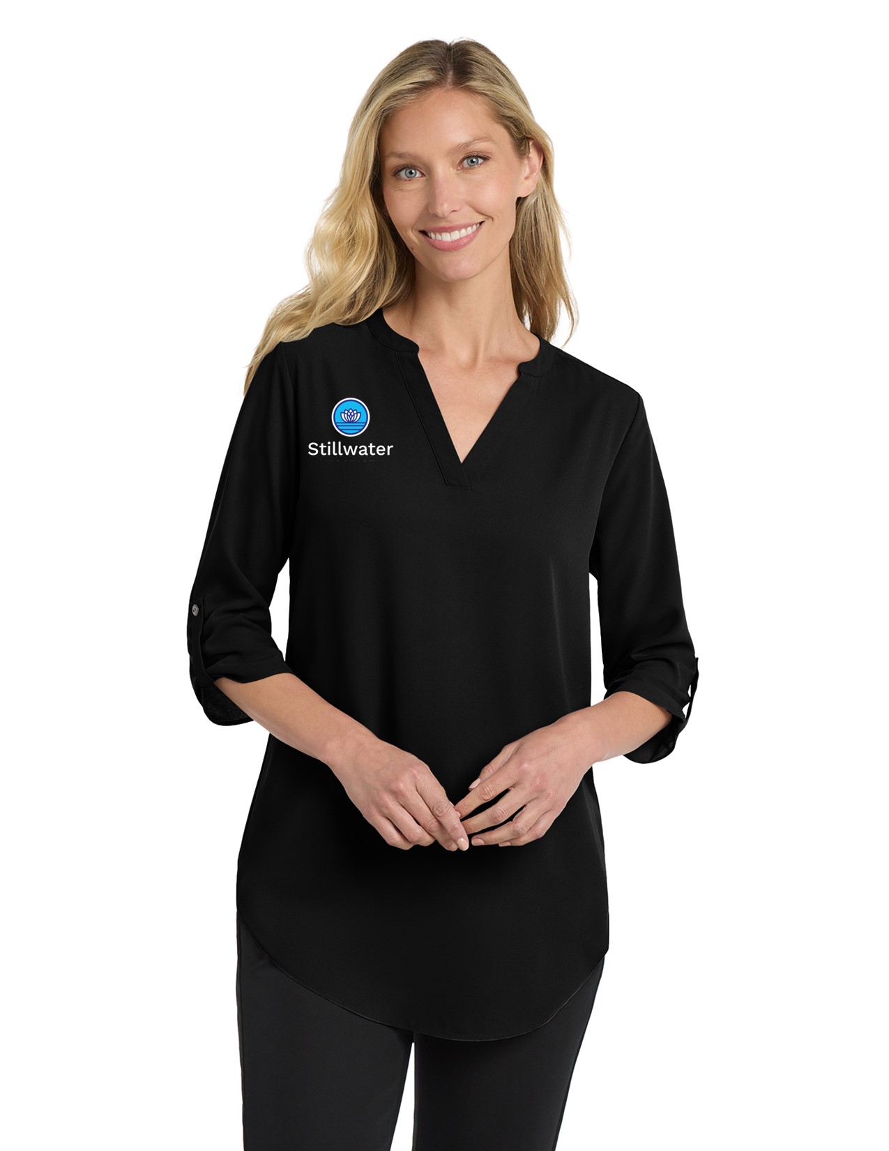 Transition seamlessly from professional life to play in this comfortable and flattering tunic blouse. 4.1-ounce, 100% polyester crepe, Split v-neck, Roll sleeves with button tabs, Longer tunic length, Gathered back detail