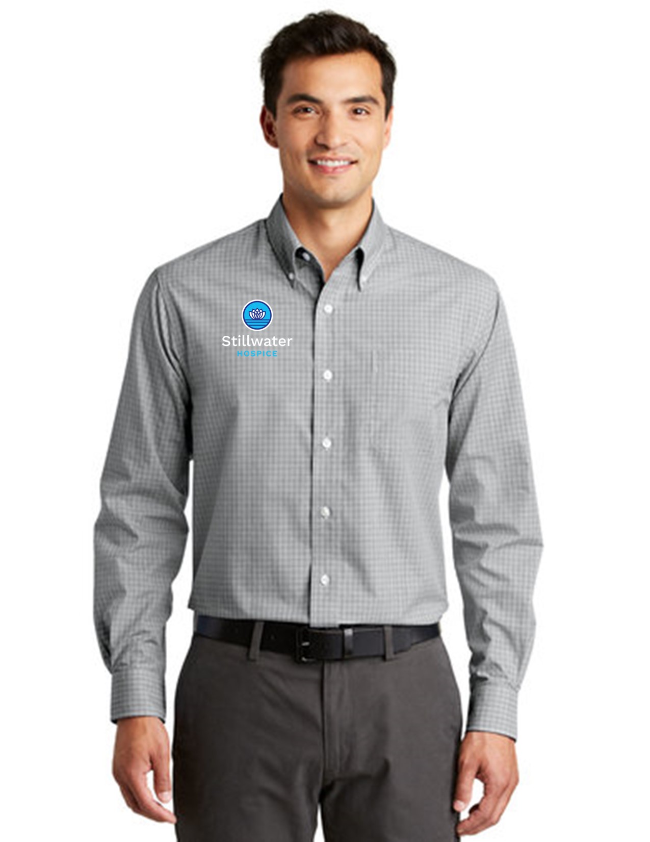 A not-too-bold plaid pattern offers a welcome break from a solid color. Designed for comfort and wrinkle-resistant convenience this yarn-dyed poplin shirt is ideal for both dress and casual wear. 3.2-ounce 55/45 cotton/poly Button-down collar Pearlized buttons Left chest pocket Back box pleat
