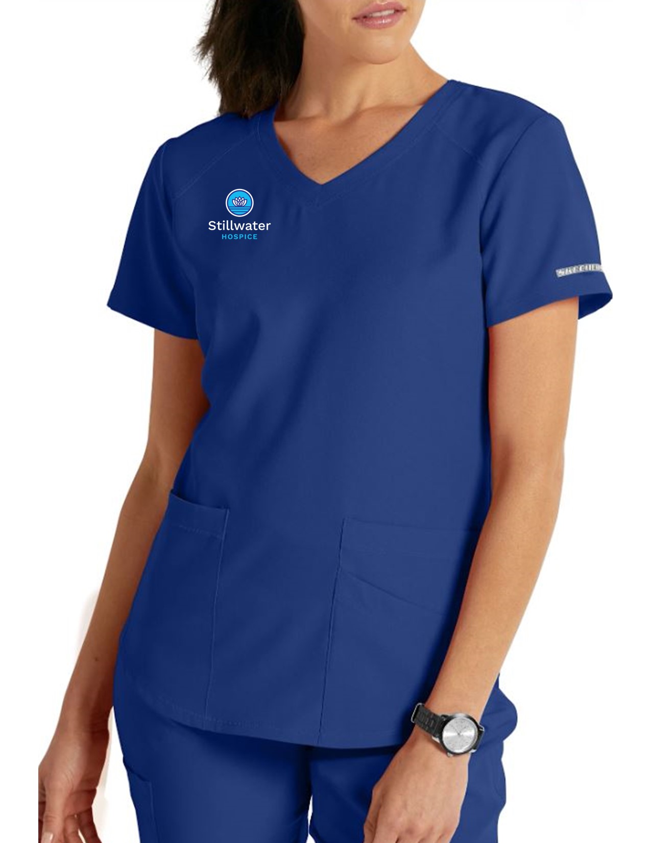 3- Pocket, VIrtual V-neck top with shaped hem. Center back length 27″