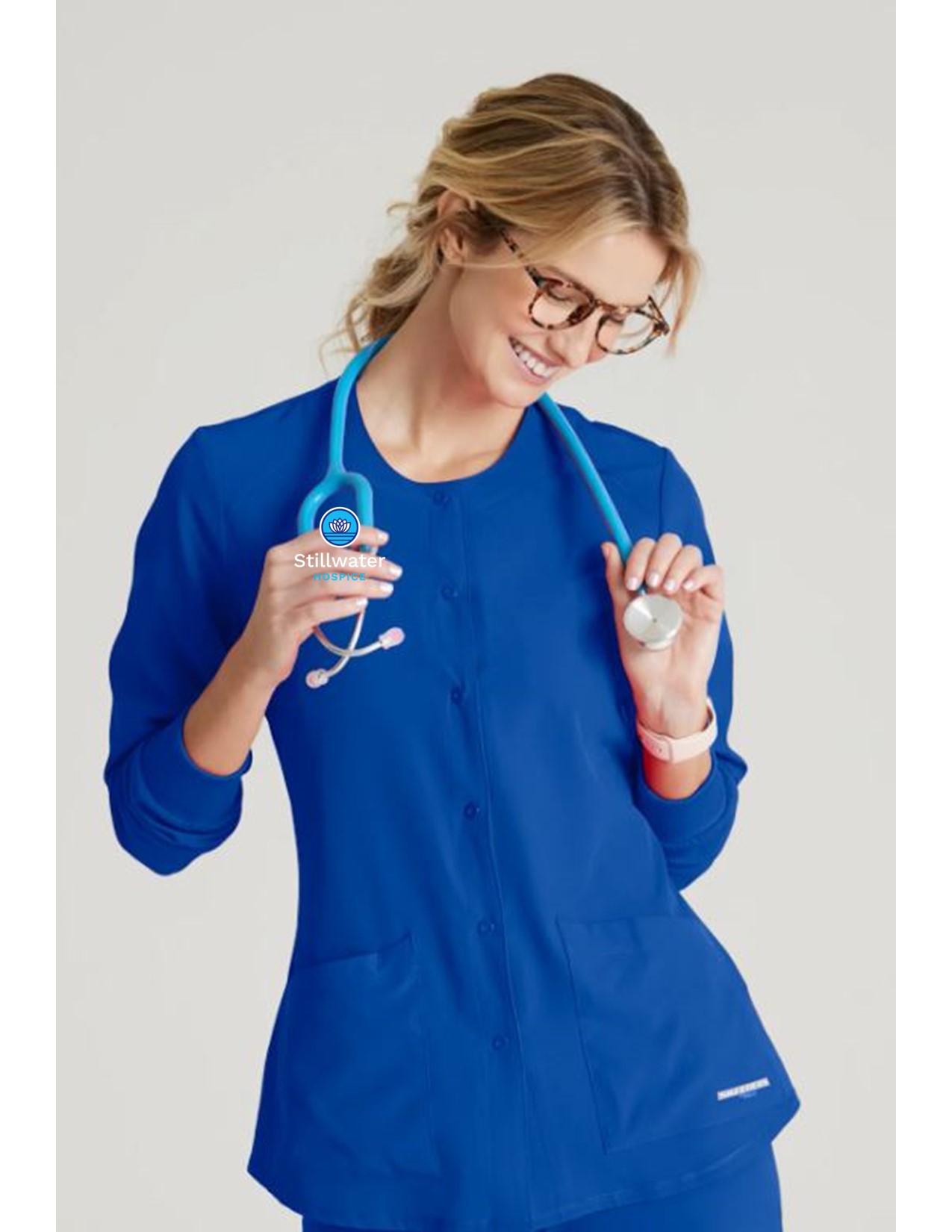 2 Pocket, Round neck snap front jacket with dyed-to-match seemless knit sock cuff sleeves.